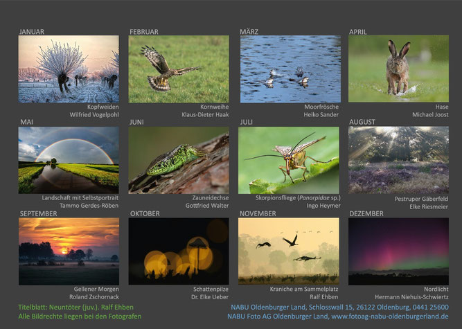Die Foto-AG des NABU Oldenburg stellt seit 2016 einen Jahreskalender aus den AG Fotos zusammen. Im Format DIN A4 werden monatlich besonders ansprechende Aufnahmen zum Thema Natur im Oldenburger Land präsentiert.